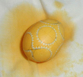 Dann legt Ihr das Ei in die gelbe Farbe. Dort bleibt es so lange, bis
