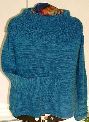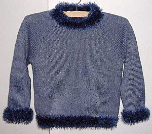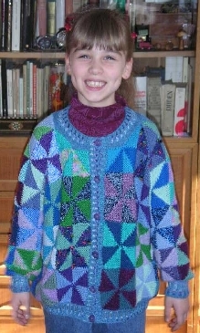 Ein selbst-entworfenes Girlie-Modell für die bereits bekannte Nichte. Ebenfalls ein Hybrid (nicht die Nichte, diese entstand auf herkömmliche Weise): die glatten Teile des Raglans wurden mit der antiken Maschine aus Tweedgarn gestrickt, Kragen und Bündchen von Hand. |