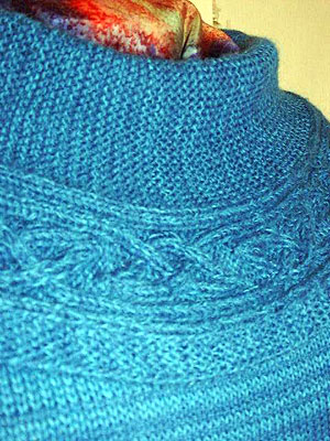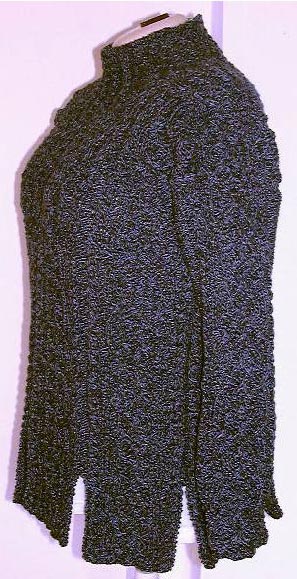 Auf Wunsch einer einzelnen Dame habe ich das Ragna-Muster (siehe auch Mantel auf anderer Seite) noch einmal im Original gestrickt, dazu Mütze und Schal. Die Dame konnte von dem Muster nicht genug bekommen. Ich mittlerweile schon. Das melierte Garn und die betagte Kamera lässt das Muster auf den Bildern nicht so gut zur Geltung kommen. In echt sieht alles sehr plastisch und an der entsprechenden Dame phantastisch aus. |