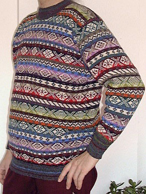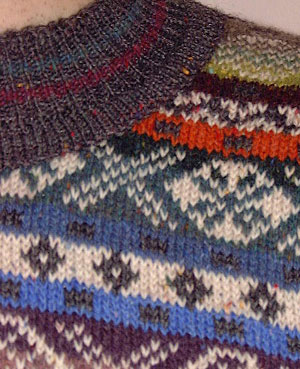 Nach all den monochromen Werken nun etwas richtig Buntes: 25 Farben wurden in diesem Fair Isle verarbeitet. Auf dem Bild erscheint viel Rosa und Lila, das ist "in echt" nicht so, eher Magenta und Purpur. Ein paar technische Daten: