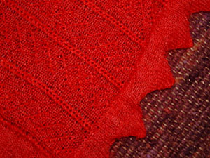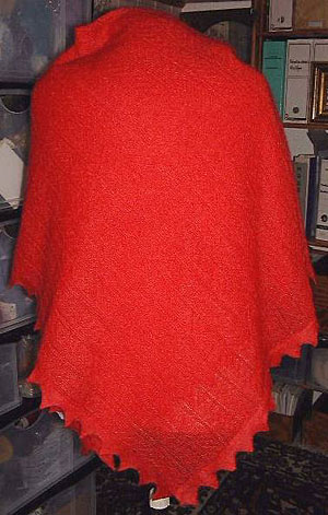 Kurz vor Weihnachten 2003 wollte eine Bekannte ein Schultertuch stricken lassen. Das Garn brachte sie gleich mit, ein hauchzartes Mohairgarn, das auf der Maschine doppelt verstrickt wurde. Ich legte Ihr zunächst verschiedene Muster vor, aber sie konnte sich nicht entscheiden, also verwendete ich alle vier, in jedem Quadranten eins. |