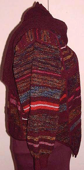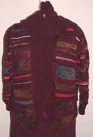 Aus Viscose-Chenille, Viscose, Baumwolle und Bourette-Seide entstand diese Schal-Jacke in Handstrick. Die Schal-Enden (fest an der Jacke) geben die Möglichkeit zu vielfacher Kragen-Gestaltung. Grundton bei allen Garnen ist ein Weinrot, leicht zu Purpur tendierend, etwas heller als auf den Bildern. Die Jacke wurde in einzelnen Bahnen gefertigt (Nadelstärke 3,5, teilweise 4), die zusammengestrickt wurden. Dadurch entstand der Eindruck, es ging rasant voran. Inspiriert wurde ich von Bildern aus einem amerikanischen Färbe- und Strickbuch namens "Country-Inspirations". |