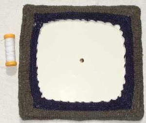ca. 3,5 bis 4 cm stricken und abketten. Das getrocknete Strickstück ohne die Biese ausmessen und den Karton passend zuschneiden, dabei 3-5 mm an jeder Kante zugeben, damit das Strickstück den Karton glatt umspannt. Die Ecken des Kartons abrunden und mit dem Nagelbohrer oder einem anderen geeigneten Werkzeug ein Loch für die Zeigerachse bohren. Die Kante der Einfassung mit Gummifaden straff, aber nicht unter hoher Spannung zusammenziehen (siehe Bild oben rechts). Zum Waschen kann das Strickstück vom Karton wieder abgenommen werden. Das Uhrwerk mit der Achse durch das Loch im Karton und das Loch im Strickstück stecken und mit der zugehörigen Schraubenmutter befestigen. Manche Uhrwerke werden ohne Aufhänger geliefert, man nimmt dann eine dünne Schnur (Nylonfaden), bindet sie zusammen und legt die Schlaufe zwischen Uhrwerk und Karton.