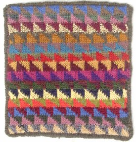Die Maschen rings um das Strickstück aufnehmen und eine Biese stricken. Die Biese bringt das Strickstück in Form und bildet einen guten Übergang für die Einfassung. Nach der Biese in jeder Ecke alle 2 Runden je 2 Maschen abnehmen (= 3 Maschen zusammenstricken). |