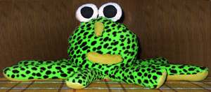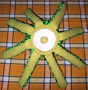 Schöne große, knubbelige Augen natürlich, und genug Platz für die Toilettenpapierrolle musste auch sein - was mich zu einem großen, runden Kopf führte. Und damit der besser stehen bleibt: Beine unten dran. Der Tintenfisch war geboren. Wobei ich ehrlich gesagt lieber Qualle dazu sage, aber mein Freundeskreis klärte mich intensiv darüber auf, dass es keine wäre. Der Rest war nicht weiter knifflig: Ich vermaß die Toilettenpapierrolle, überlegte mir, wie groß die beiden Kreise für den Kopf werden müssen, damit er einigermaßen Form erhält, und wie groß die Beine im Verhältnis dazu sein sollten. Für Kopf und Beine fertigte ich auch Schablonen an, die Größe der Augen war dagegen mehr Intuition, und die Idee von Nase und Mund entstand sowieso erst während des Arbeitsprozesses. Im Laden bin ich dann auf diesen supergenialen, grün-gepunkteten (und im übrigen wunderbar weichen) Vlies-Stoff gestoßen, der - wie ich finde - super passt. Um dem Ganzen mehr "Räumlichkeit" zu geben, entschloss ich mich, die Unterseiten der Beine einfarbig zu gestalten. Dazu habe ich gelblichen Vlies gekauft, der ebenfalls angenehm weich ist. (Das ist ein richtiges Kuschel-Stölpchen. :-)) Für die Augen habe ich alte Socken verwendet: Frottée für das Weiße, glatte Baumwolle für die schwarze Pupille.