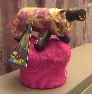 der Kopf hin und her und auf Kopf und Füße bestehen aus braun angemalten Sektkorken. Augen,
