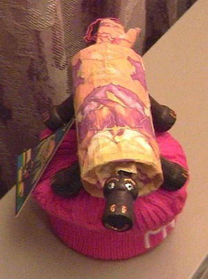 Nase, Mund und Zehen wurden mit Glitzerkleber aufgemalt. Um den Bauch hängt ein bedrucktes Pappdreieck, das man mit ätherischem Öl beträufeln kann (wodurch dieses Stölpchen also auch gleich noch den obligatorischen Duftbaum ersetzt). Warum nun 5-in-1? Weil dieses Stölpchen mehrere Funktionen in sich vereinigt: